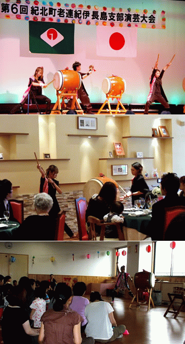 主な演目 ・「組太鼓」 ・「八丈島太鼓」 ・「曲打ち」 曲打ちでは、演歌、童謡、アニメソングを演奏します。 主な出演先(順不同) 紀伊長島支部演芸大会(三重県北牟婁郡) プレ葉ウォーク浜北(静岡県浜松市) 豊川コロナワールド(愛知県豊川市) 大垣コロナワールド(岐阜県大垣市) 健峰幼稚園お楽しみ会(愛知県名古屋市) 名古屋文理大学大学祭『稲友祭』 (愛知県稲沢市) 学園祭、子育て支援センター、幼稚園、結婚式余興等 イベント多数出演
